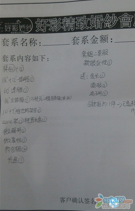 人于8月14號(hào)在好彩婚紗攝影約定了一套婚紗照原價(jià)5999元(惠州奧地利小鎮(zhèn)攝影基地3套衣服+仁化好彩專(zhuān)用奧斯卡攝影基地3套衣服)。     和店員協(xié)商后優(yōu)惠價(jià)為5299元,另外贈(zèng)送一套全新婚紗。     ...
