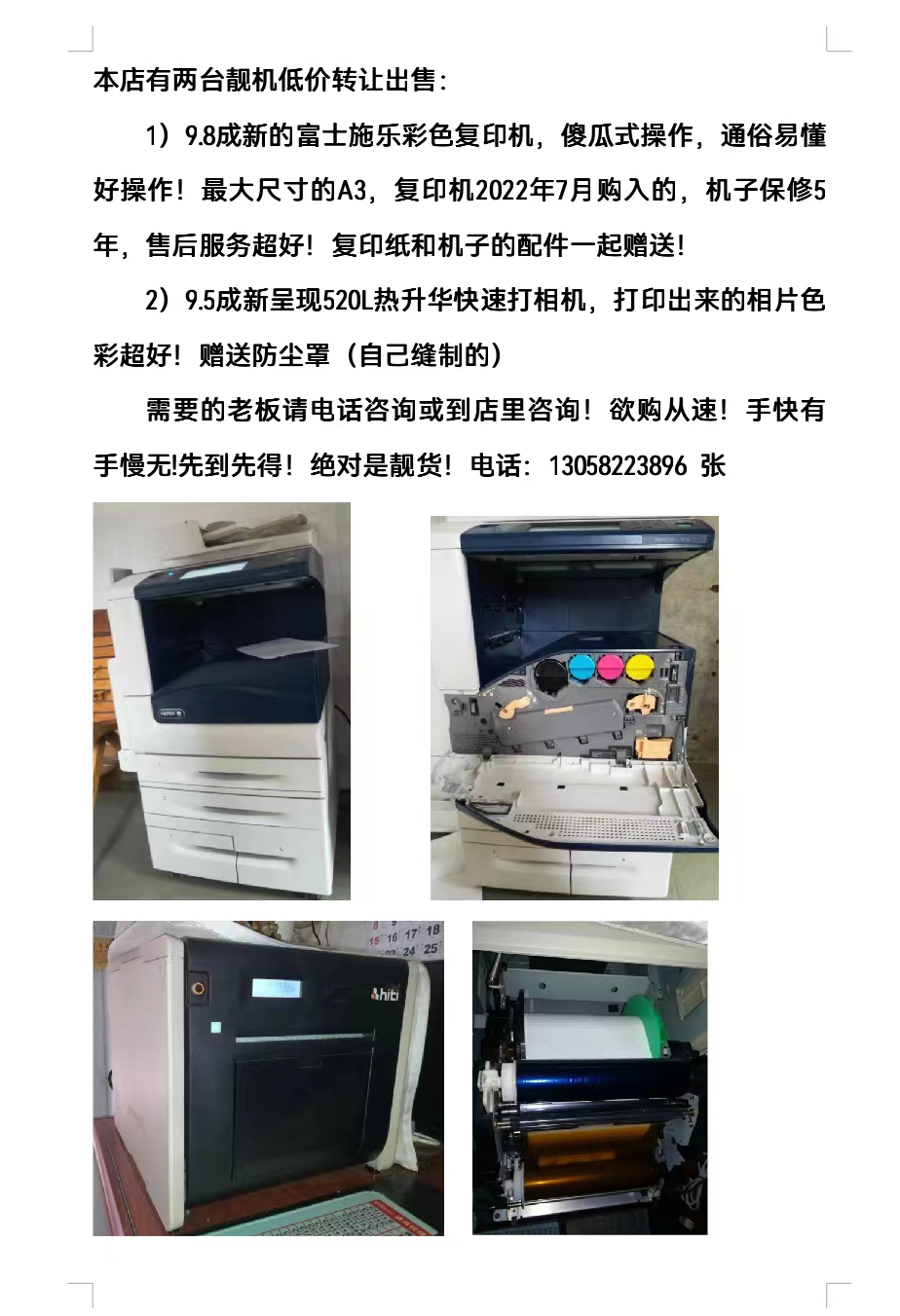 2)9.5成新呈現(xiàn)520L熱升華快速打相機,打印出來的相片色彩超好!贈送防塵罩(自己縫制的)誠意者請電話咨詢或到店里咨詢!非誠勿擾!絕對是靚機!手機:18575109808  陳小姐